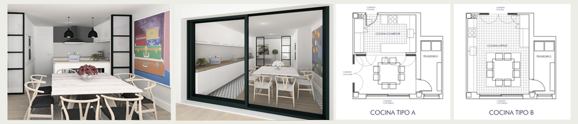 Se ha diseñado cuidadosamente la distribución de las cocinas disponibles, en conjunción con los espacios, pavimentos, iluminación y ventilación presentes en el proyecto. Cocinas contemporáneas, fáciles de usar y mantener, cómodas y atractivas. Materiales robustos y duraderos, herrajes que facilitan el uso. Disponibles 2 modelos de distribución de cocina, adaptables a cada una de las viviendas.